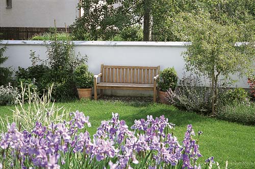 Hned za vstupní brankou nás vítá příjemná a pohostinná paní domácí v patách s dvěma hlídači a domácími mazlíčky – bílými teriéry. Spořádaně se pohybují jen po kamenitých pěšinkách či po trávníku, jako kdyby věděli, že vstoupit do krásně upravených záhonů by byla náramná škoda. Je slunný den, zahrada je plná květů a motýlů, proto není divu, že naše návštěva začíná procházkou po zahradě. Teprve poté se usazujeme v atriu u hospodářské části stavby a společně s architektkou pozorujeme zahradu. „Před pár lety tu byl jen trávník a sem tam nějaký ten keřík. Je tu velmi jílovitá půda, bylo třeba sem navézt spoustu kvalitnější půdy a vytvořit několik drenážních jímek, jinak by se tu rostlinám moc nedařilo,“ ochotně vypráví paní domácí. Ačkoli velká část péče o zahradu leží na bedrech jejích majitelů, alespoň část práce jim ušetří závlahový systém. „Pečlivá péče majitelů je na zahradě vždycky vidět. Záhonů je tu na přání paní domu opravdu požehnaně, ale abychom jí péči aspoň v něčem usnadnili, podložili jsme půdu v záhonech geotextílií a zasypali ji kůrou, takže plevel by neměl tolik bujet,“ vysvětluje Hana Říhová.