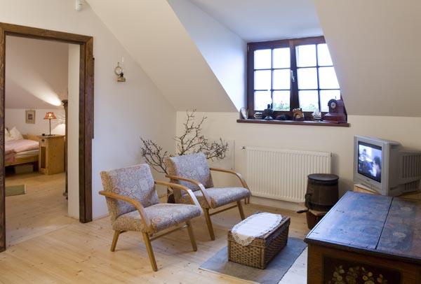 Druhý menší obýváček se nachází v patře naproti schodišti.