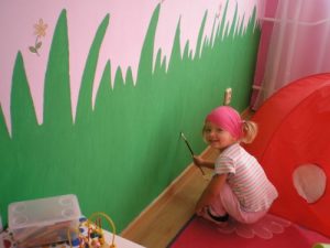 „Výmalba probíhala tak, že jsem dala Karolínku spinkat,a já šla dotoho. Nejdřív jsem si nanečisto tužkou nakreslila travičku atd… a pak colorky za 65,-Kč a „fičela“ jsem do půlnoci, každý den něco. Inspiraci jsem měla ze své hlavy a také mě napadlo kouknout do omalovánek, tam bylo z čeho vybírat. Začala jsem v pondělí a končila v pátek.“