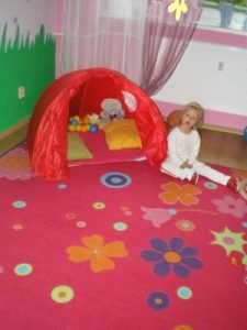 Nejraději si Karolínka hraje ve stanu, který má v rohu pod oknem a také ráda kreslí. K tomuto účelu má v pokojíčku malý kreslící koutek.