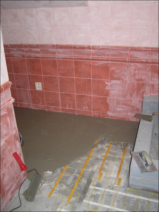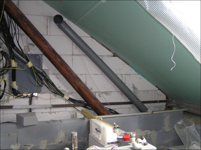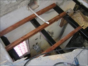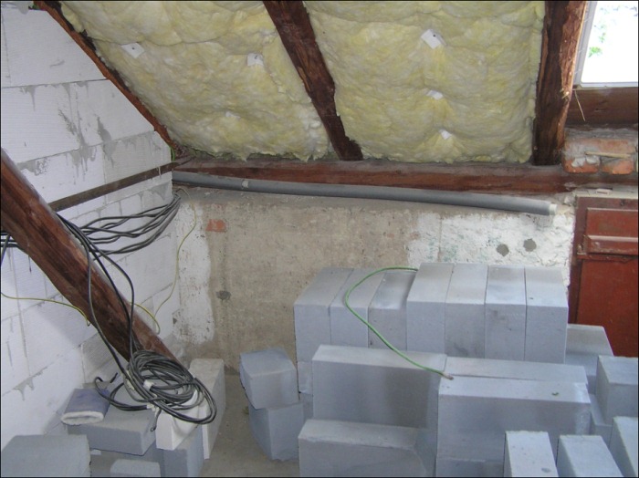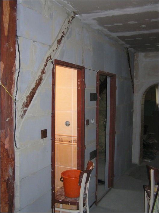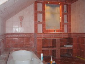 Před započetím stavby zdí koupelny a WC bylo nejdříve nutné odstranění stropního trámu a výroby konstrukce, která tvořila druhou podlahu na které nyní stojí samotná vana.