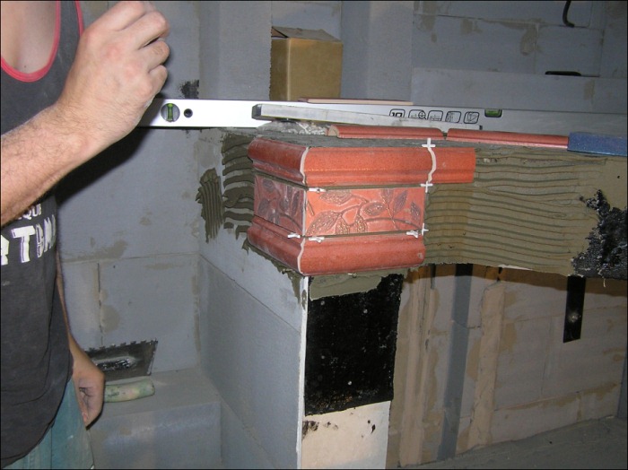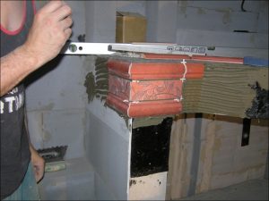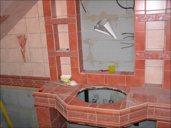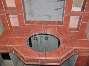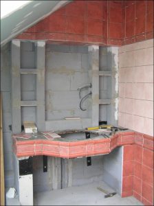Konečné rozhodnutí padlo na pult s umyvadlem. Samotné zdění pultu nebylo nijak náročné. Nosná vrchní část pultu je kovová s opláštěním dřevotřískou a na povrchu je nalepená izolační lepenka kvůli ochraně zatečení. Zbylé části jsou vyzděny stejně jako zdi z porobetonových tvárnic.