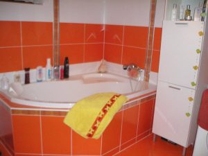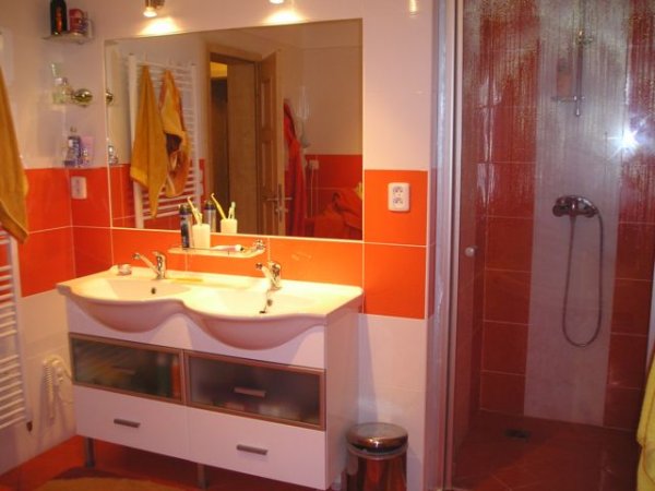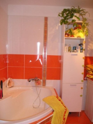 Původně si majitelka představovala vzhled koupelny trochu jinak: „Koupelnu jsem chtěla zelenou, ale nakonec vyhrála oranžová.“