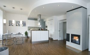 ostrůvek opláštili stejným materiálem ze kterého je podlaha,