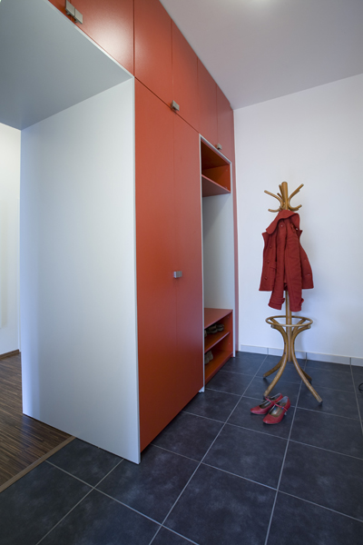 Aby té bílé nebylo v celém bytě příliš, dostala v předsíni prostor výrazná červená barva.