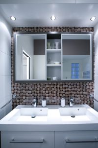 V koupelně jsou zkombinovány velkoformátové obklady s drobnokresbou barevné skleněné mozaiky. Luxfery propouštějí do koupelny trochu denního světla.