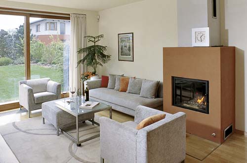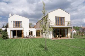 „Nejprve jsme chtěli postavit domov pro celou naši velkou rodinu, ale jak děti dospějí, rozletí se do světa a chtějí žít samostatně. Později jsme navrhovali dvougenerační dům se dvěma oddělenými, soběstačnými částmi. Představovali jsme si, že jedna rodina bude obývat přízemí a druhá poschodí,“ vypráví paní. To však dcera architektka odmítla a od počátku prosazovala koncepci dvojdomu. Jednak považovala za rozumné, aby obě rodiny žily zcela samostatně, jednak chtěla, aby oba byty měly rovnocenný vztah k zahradě. „Teď to stále víc oceňujeme, protože obě úrovně bytu jsou něčím příjemné. Bezprostřední výstup z přízemního pokoje i pohled do zahrady shora, třeba brzy ráno nebo večer,“ dodává s úsměvem. Proto středová společná chodba odděluje dvě křídla se samostatnými dvoupodlažními byty. Zastavěná plocha a obestavěný prostor zůstávají stejné, ať dům rozdělíme rovinou vodorovnou nebo svislou. Zvolený koncept sice vyžaduje stavbu dvou schodišť, ale mnohem lépe zajišťuje soukromí obou rodin. Podle původní představy měl dům respektovat funkcionalistické pojetí, měl být zakryt plochou střechou. Územní rozhodnutí však diktovalo střechu sedlovou nebo valbovou, červenou nebo hnědou, dále vyžadovalo začlenění garáže do tělesa domu, předepisovalo poměr zastavěné plochy pozemku, odstupy od hranic, poschodí bylo naštěstí povolené. Regulativy, které byly všechny dodrženy, tedy v mnohém ohledu zformovaly stavbu do poněkud jiné podoby, než byl původní záměr.