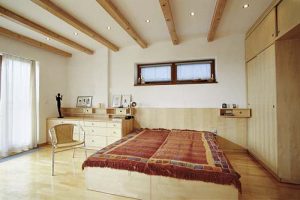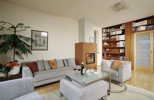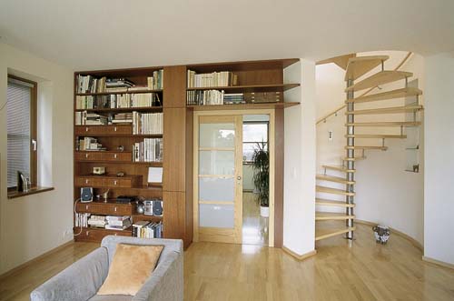 Každá z obou částí domu je pochopitelně řešena zcela rozdílně, aby optimálně vyhovovala svým obyvatelům. Byt rodičů je pojat téměř celý jako jeden propojený prostor, přesto neohromí nežádoucí rozlehlostí. Rozčleněním na jednotlivé zóny působí velmi útulně. Z chodby vejde host do jídelny, stranou od ní je umístěna kuchyně. Klubová část otevřená do zahrady se nachází dále v hloubi lomeného prostoru, na pravé straně za schodištěm oddělují posuvné dveře hostinský pokoj. I ve vertikálním směru je propojení obou podlaží točitým schodištěm zcela volné, což může dvěma bydlícím vyhovovat. Přesto manželé uvažují o zabudování skleněné stěny v poschodí, která by ložnici uzavřela. „Bydlení zcela naplňuje naše představy. Chtěli jsme druhou ložnici s vlastní koupelnou v přízemí, která dnes slouží jako hostinský pokoj, ale do budoucna je třeba myslet na bezbariérové bydlení,“ vysvětluje paní. Světlým interiérům dominují teplé tóny dřeva. Pro podlahové topení je vhodná podlaha z dubu nebo jasanu. Protože z dubového dřeva bývalo svého času vyráběno mnoho nábytku, cítila paní jisté přesycení a volba padla na jasan. Stejné dřevo se uplatnilo také na dveřích. Na jídelnu a knihovnu si vybrali třešeň, celá ložnice je ze světlého javoru. Na technologickém vybavení domurealizoval pro změnu své představy o moderním bydlení majitel – vytápění tepelným čerpadlerm, řízená ventilace s rekuperací tepla, počítačová a komunikační síť a tak dále. Za zmínku stojí i to, že pod garáží je zabudována jímka k autom,automatickému zavlažování. „Jsme spokojeni. Splnili jsme si, po čem jsme toužili od pětadvaceti let. Rodinný dům se stále vyvíjí, jak rodina žije, stále je co vylepšovat,“ hodnotí paní domácí.