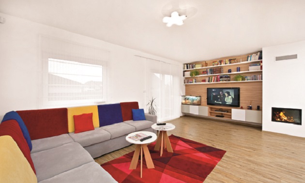 Z prostorného zádveří s vestavěnými skříněmi se vstupuje do hlavní obytné místnosti, dětské herny nebo do prádelny, která je spojovací místností s garáží. Hlavní obytný prostor je doslova srdcem domu. Zde se celá rodina schází ke společným debatám, k jídlu i televizi. Přijímají se zde i návštěvy, které mohou obdivovat krásné velké akvárium, katedrálový strop, ale především oboustranný krb, který tento otevřený a velmi vzdušný obytný prostor předěluje. Z obývacího pokoje se nabízí výstup po mírně zaobleném dubovém schodišti (mořeném do třešně) na galerii do podkroví. Z prostoru obývacího pokoje se vstupuje také do velké prosklené místnosti s vyhřívaným bazénem. Plocha této místnosti je 74 m2 .