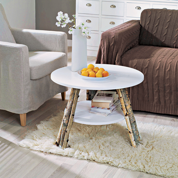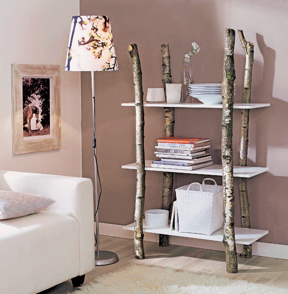 Regál drží pohromadě čtyři březové větve o průměru přibližně 6 cm.