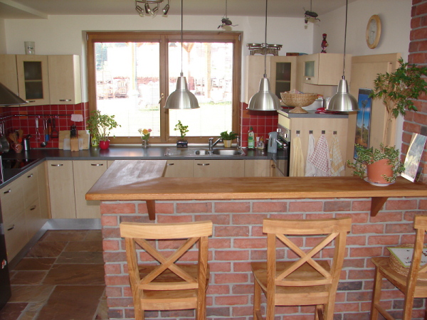 Přestože jsou všechny místnosti v domě nadmíru prostorné a každá poskytuje dostatečné zázemí pro plnění účelu, ke kterému byla určena, nejčastěji je využívána kuchyně. Zde se odehrává mnoho činností, často i sledování televize. Na prvním místě je ale samozřejmě příprava jídla, z které však činí dokonale vybavená kuchyňská linka doslova potěšení. Majitel s úsměvem dodává: „Manželka se vždy už těší z práce domů, aby mohla vařit.“ Není divu, neboť kuchyně zhotovená dodavatelskou firmou na míru je vybavena vším, co si jen lze přát. Všechny spotřebiče jsou navíc od stejného výrobce a tak je jejich ovládání mnohem snadnější. Stejnou značku nese dokonce i bazén, který je rovněž velice často využíván. Je sice menší, ale se vším vybavením. Slouží především pro relaxační účely.