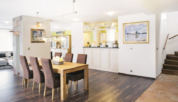 Těžištěm pokoje je bytelná rozkládací pohovka značky Koinor, rustikální jídelní stůl s různými židlemi pak už jen podtrhuje útulnost obytného prostoru. Použité kusy nábytku, dekorační předměty a tapety jsem vybírali tak, aby spolu perfektně ladily.