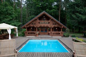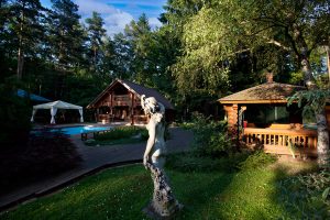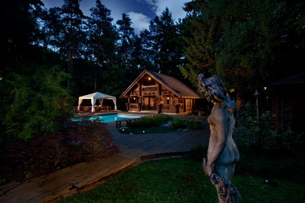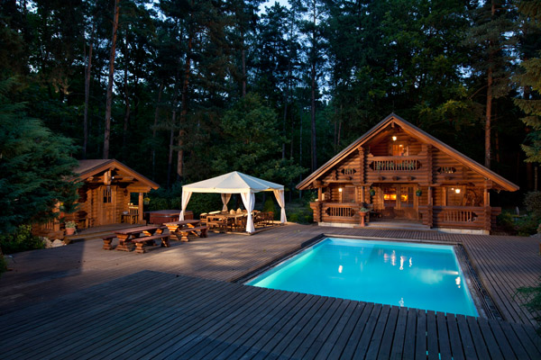 Skutečnou harmonii s přírodou představují dřevostavby umístěné v lesoparku. Dominuje jim lovecká chata se třemi ložnicemi, dvěma WC, koupelnou, kuchyní a obývací místností s krytou terasou. Mezi srubem z prvotřídních finských borovic, zahradním depandancem, finskou saunou, krytou vířivkou nebo desetimetrovým venkovním bazénem se lze pohodlně přesouvat i na boso, po příjemných dřevěných podlážkách.