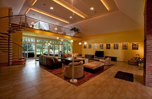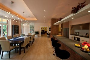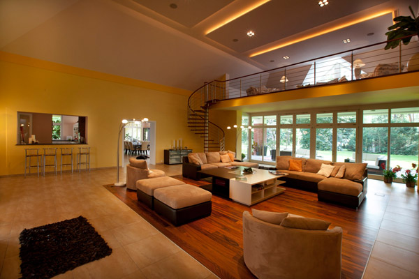 Centrální a zároveň nejrozlehlejší místností celého domu je se 120 m2 obytná aula v mezonetovém stylu s ochozem nad schodištěm. Prostorové řešení místnosti zajišťuje dostatek místa pro neomezenou zábavu a pohodlí. Terasa poskytuje prostor s letní kuchyní pro barbecue či příjemné venkovní posezení.