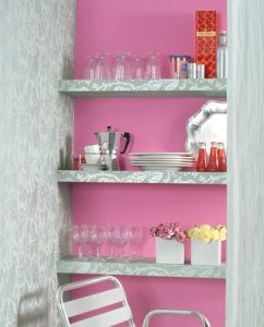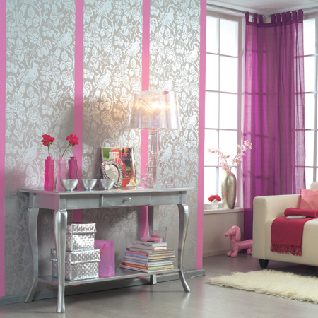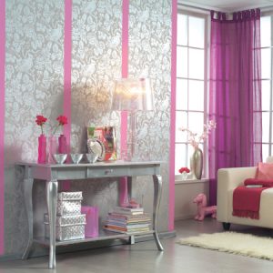 pokoje je stěna vlevo od okna. Nejdříve jsme stěnu natřeli růžovou barvou a poté jsme nalepili s určitými odstupy od sebe tři pruhy luxusní tapety. Konzolový stolek jsme natřeli stříbrnou barvou a ve stejném stylu pak byla upravena partie kolem okna a nové nástěnné poličky.