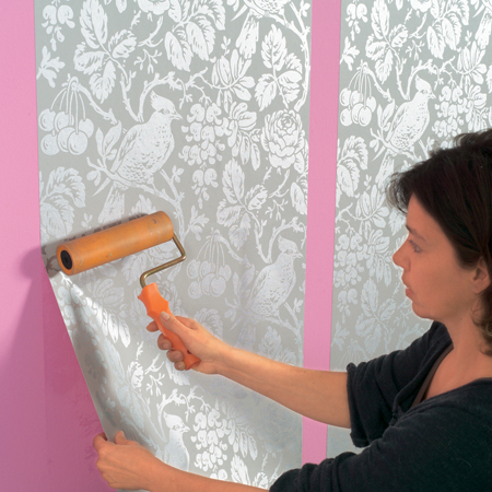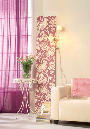 Působivou dekoraci tvoří obyčejná dřevotřísková deska polepená výraznou tapetou. Výsledkem je obraz, k jehož upevnění nepotřebujete hřebíky ani šrouby, navíc poslouží jako nosná plocha k upevnění nástěnného osvětlení. Aby byl výsledný efekt dokonalý, je třeba pečlivě nalepit tapetu kolem hrany desky. V zájmu stability můžete desku upevnit na zeď pomocí obrazových závěsů. S tapetou ladí polštářky na pohovce a závěs před oknem. Jednobarevné látky působí honosně a dávají vyniknout nápadnému vzoru na tapetě.