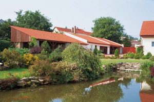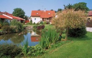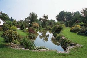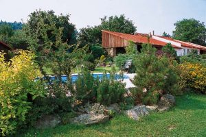 „Rybník tu byl vždycky, ale nechali jsme jej zvětšit a osadili jej nejrůznějšími vodními rostlinami. Život, který se odehrává v něm i kolem něj, nás fascinuje“, vyznává se majitelka. Vedle rybníka i potůčku jsou vysazeny bohatě kvetoucí rododendrony, ale i jiné keře a barevné traviny. Největší okrasou je však japonská vrba, která se na konci léta halí do jemně růžové barvy.