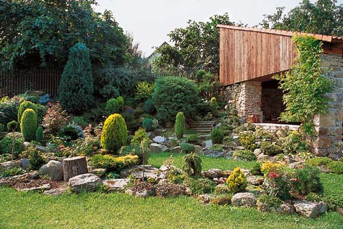 K rodinnému koupání je určen bazén, který je dobře skryt za meandrem z jehličnanů a nenarušuje tak přírodní ráz zahrady. V jeho blízkosti se nachází skalka, kterou tvoří převážně zakrslé kleče a jehličnany. Bonsaje samozřejmě také nechybějí. Ve spodní části zahrady vyrůstá ovocný sad. „S ním bude ještě hodně práce“, tvrdí majitelka, „některé stromy zmlazujeme, ty přestárlé kácíme a vysazujeme nové. Ale už dnes nese své plody – o jablka, švestky i ořechy se podělí celá rodina.“