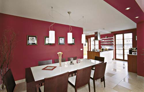 „Interiéry jsme volili moderní, nechtěli jsme rustikální styl. Požadavek byl na přírodní materiály, dřevo a keramiku. Pracovní desky v kuchyni jsem si vysnil kamenné, jsou z leštěné žuly. Dobře se na nich pracuje a jsou odolné.“ Na skříňkách se uplatnila třešňová dýha a matný hliník. „Vybírali jsme si barvu na stěny obytného prostoru, aby se rozčlenil a oživil. Když se stěny začaly barvit, byli jsme trochu vylekaní, ale v kombinaci se světle šedou se líbí nám i každé návštěvě.“ Ani nepřekvapí, že v tomto domě nenajdeme ozdoby zcela pochybné estetické kvality, nicotné myšlenkové hloubky a sporného citového náboje. Na závěr majitel hodnotí: „Udělal bych větší úložné prostory. Mohl bych mít i větší garáž. Myslím, že dům se povedl, bydlí se nám tu velmi dobře.“