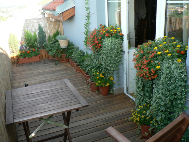 První fotografie (níže) pěkné terasy zaslala paní Blažková z Brna: „Protože je terasa orientována na jihozápad, musela jsem vybírat rostliny snášející celodenní plné slunce. Také se velmi se osvědčily prostorné samozavlažovací truhlíky. Několikaletým zkoušením „pokus – omyl“ mohu právě na plné jižní slunce doporučit hvězdičku přímořskou (Asteriscus maritimus), gazánie, ale také minipetúnie (millionbells). Předěl mezi terasami během 2 let pokryl (s oporou) přísavník pětiprstý (psí víno). Ten jsem jen nařezala na jedné jarní vycházce kolem řeky, velmi brzo zakořenil a pak jsem jej vysadila do truhlíku.