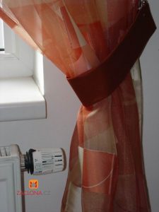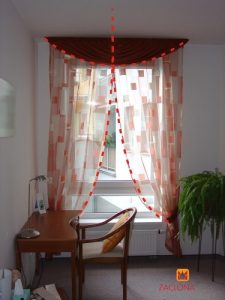 Jde o to, že záclona je doplněna dekorační látkou v podobné barevnosti, jaká se vyskytuje na zácloně. Lidské oko tak vnímá dekoraci jako ucelenou, neboť se jedná o kombinaci záclony a závěsu. Tedy pro naše podmínky běžné stínění. Dalším aspektem dekorace je její celistvost tvarová. Volán je vlastně půlka elipsy v horizontální podobě a látkové úvazy vytvářejí doplňující elipsy v poloze vertikální.