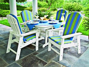 Tento nábytek se vyrábí z plastu Polywood, který skvěle odolává povětrnostním vlivům i slané nebo chlorované vodě. K dostání je ve dvanácti barvách. (Křeslo: 10 990 a sedák 2990 Kč, La casa Nova)