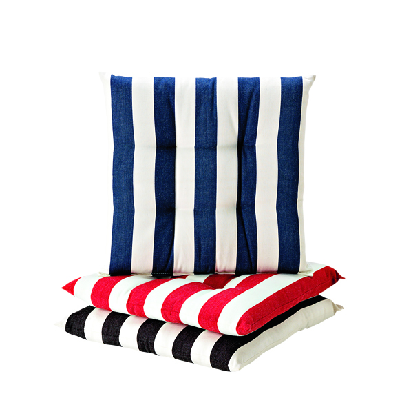 Sedáky k zahradnímu nábytku o velikosti 40 x 40 cm výborně poslouží i na kuchyňské židle. Společně s pruhovanými závěsy nebo ubrusem dakážou vytvořit osobitý interiér. (199 Kč, IKEA)