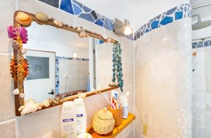 Koupelna je pojata ještě netradičněji než kuchyně spojená s jídelnou. Místo očisty si manželé Štikovi kompletně navrhli i dotvořili sami. Na podlaze je klasické modrá dlažba, na stěnách pak velmi neutrální béžový obklad, sanitární keramika je také běžných tvarů. Prostoru dominuje originálně vyzděný sprchový kout doplněný o modré luxfery. Samotný kout je obložený mozaikou ze střepů. Mirka využila rušení prodejny obkladů a skoupila různé vzorky, které pak rozbila a vytvořila z nich originální mozaiku. Ta je nejen ve sprchovém koutě, ale v modrém podání lemuje i béžový obklad na stěnách. Výsledek je velmi efektní a náklady na realizaci byly téměř zanedbatelné. Na druhou stranu to však stálo spoustu invence, trpělivosti a hlavně času. Nyní jsou manželé rádi, že je tato fáze již za nimi.