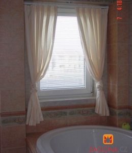 Závěsný systém byl vyřešen rozpěrnou koupelnovou tyčí, která umožňuje uchycení bez montáže. Volba barvy byla správně bílá, jelikož se hodí jak k oknu a žaluzii v pozadí, tak i k vaně v popředí. Zároveň je správně takový designově příliš nevýrazný prvek spíše potlačit.