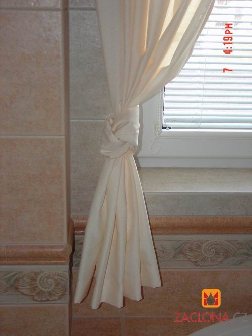 Aby dekorace neclonila výhledu a vytvářela již zmíněný design, bylo zapotřebí docílit jejího „stažení“ z prostoru okna. Opět bez vrtání a vtipné řešení bylo použití jednoduchého uzlu.