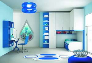 Modrá uklidňuje, její použití v místnosti pro teenagera, rozptylovaného řadou podnětů, je správnou volbou. (135 870 Kč, Moretti Compact – Finezza Design)