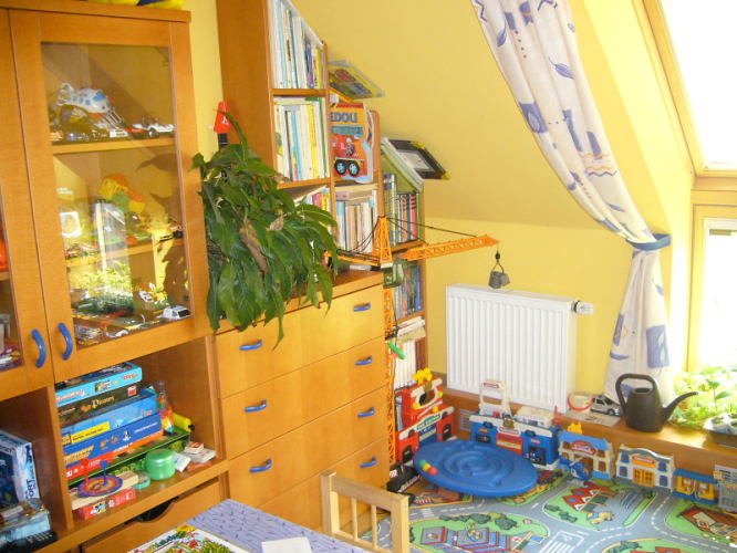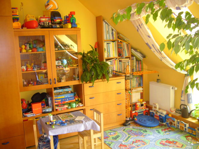 Podkrovní pokoj se vymalován příjemnou žlutou barvou, jež působí optimisticky. Opět zde můžeme vidět koberec s motivem dopravy ve městě, který kluci jistě ocení.