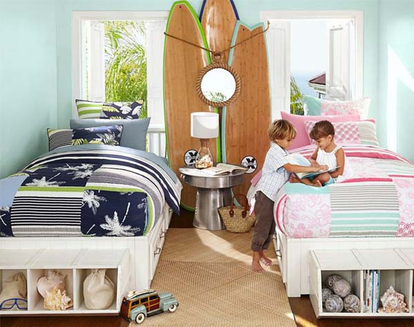 Ideální je natřít dvě stěny pokoje na jednu barvu a další dvě dle gusta druhého dítěte. Stejně tak volte doplňky, které se k oné barvě budou hodit nejvíce. Na první pohled pak půjde poznat, která strana pokoje komu patří.