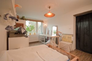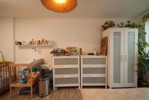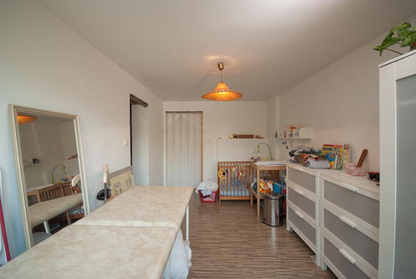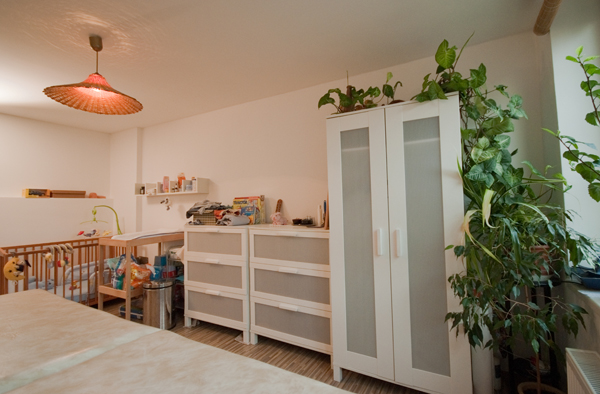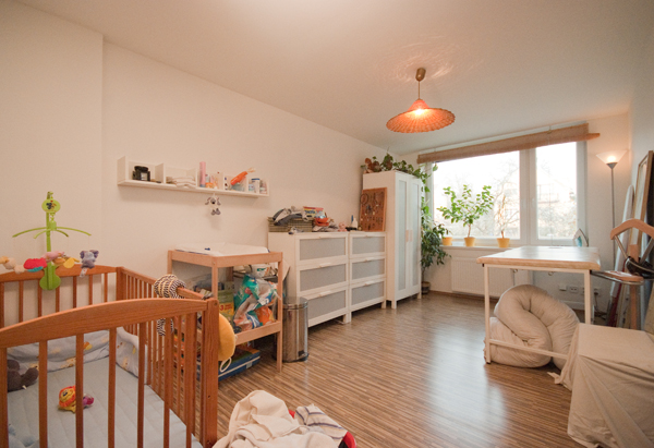 Původní prostor připomíná dětský pokoj jen dětskou postýlkou a přebalovacím pultem. Je vidět, že se rodiče k zařízení dětského pokojíku ještě nedostali. Je zde navíc umístěno masérské lůžko a zcela chybí prostor vymezený pro hraní.