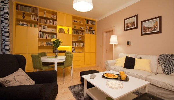 Bude potřeba hlavní obývací místnost prosvětlit, rozjasnit a odlehčit při zachování účelnosti prostoru. Pro maximalizaci úložných prostor vyrobíme vestavnou multifunkční stěnu. Prostor rozdělíme na logické zóny: jídelnu a obývací část s novou pohodlnou sedačkou s více místy na sezení a čtecím koutkem. Naše proměna bude inspirovaná vitalitou a pohotovostí babičky a jejího manžela. I když paní táhne na 70 let, ráda se učí novým věcem, hlavně ovládání moderní elektrotechniky a internetu. Má velkou radost a chuť do života. Proto jsme se rozhodli pro veselou proměnu, plnou barev a moderního, ale pohodlného nábytku. Hlavní barvou bude žlutá, doplněná béžovou, bílou a červenou.