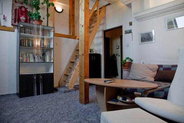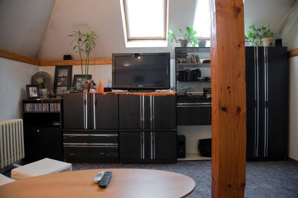 Stávající obývací pokoj v podkroví není příliš velký, navíc je zde i strmé schodiště, které vede do prostoru nahoře (pracovnička). Na zařízení už nezbyly peníze, a tak je k vidění typicky provizorní vybavení včetně staršího tmavého nábytku a dalších nesourodých kousků.