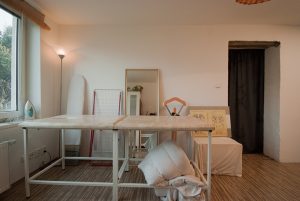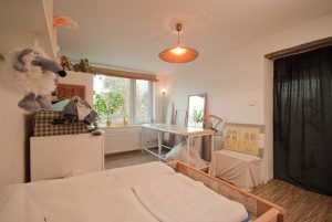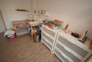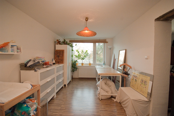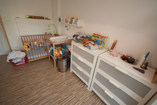 Původní prostor připomíná dětský pokoj jen dětskou postýlkou a přebalovacím pultem. Je vidět, že se rodiče k zařízení dětského pokojíku ještě nedostali. Je zde navíc umístěno masérské lůžko a zcela chybí prostor vymezený pro hraní.