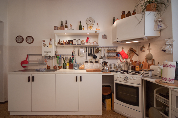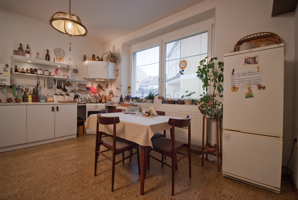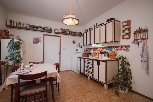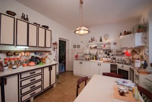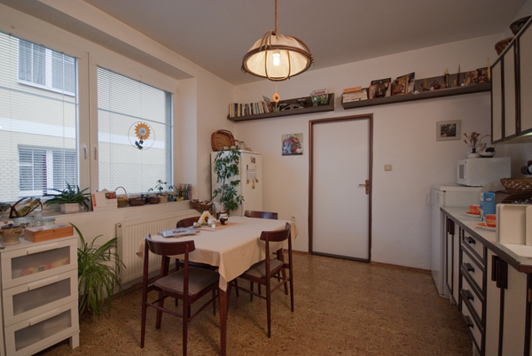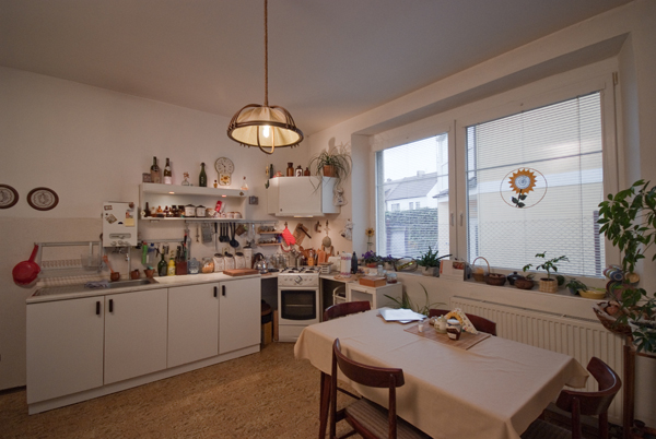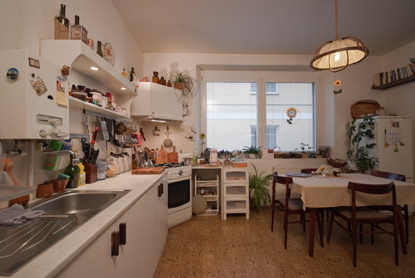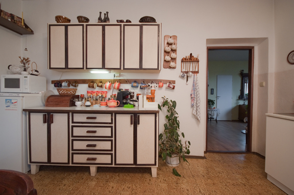 Původní dispozice v kuchyni není vůbec ideální. Pracovní plochy jsou „roztroušené“ po celém obvodu kuchyně, což není vhodné a efektivní při vaření. Vůbec celkový vzhled kuchyně působí hodně chaoticky, je plný různých kousků nábytku různého stáří. Nábytek byl evidentně pořizován postupně, zřejmě proto, aby nahradil chybějící pracovní plochu.