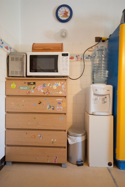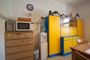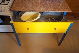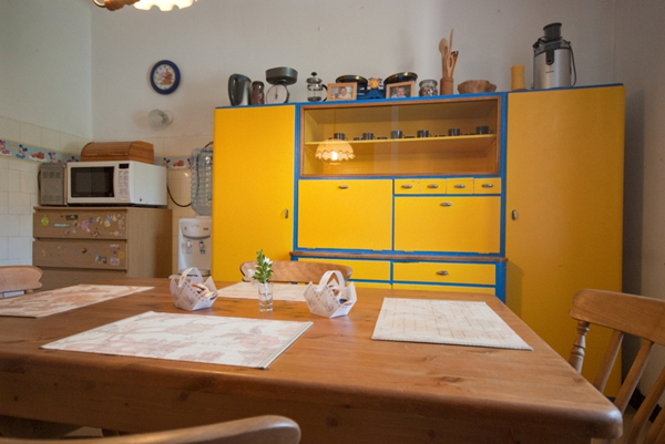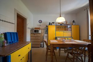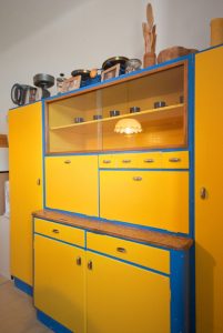 Současný interiér je velmi originální a má kouzlo – majitelé svépomocí udělali až dost. Je tu k vidění například stará kredenc natřená žlutě a modře nebo obklady v retrostylu. Přesto kuchyň potřebuje razantní změnu, a to hlavně z praktického hlediska. V lince chybí myčka a pracovní plocha je téměř k nedohledání.