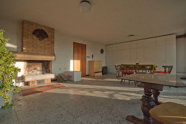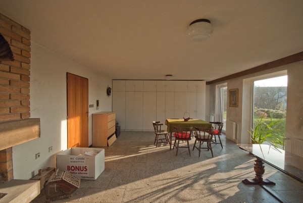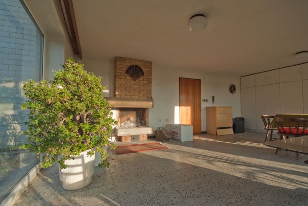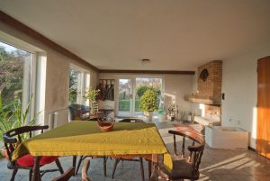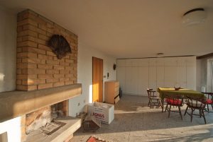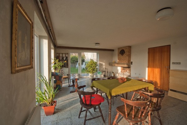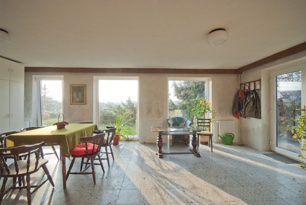 Prostor, který si přejí přetvořit, je v současnosti zimní zahradou s velkými, do zahrady otevřenými francouzskými okny, terasovou dlažbou na podlaze a otevřeným krbem. Jak mu designéři jednoduše změní tvář?