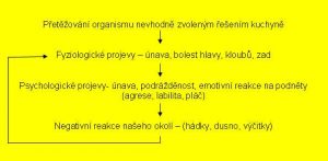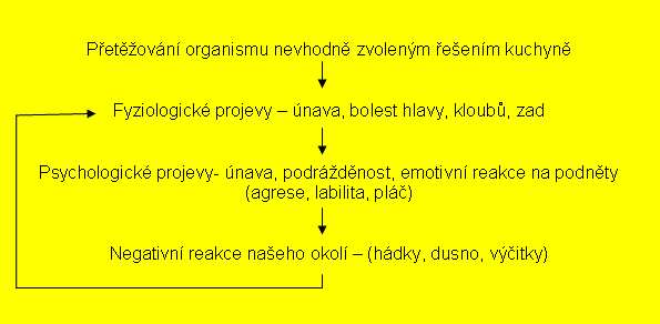 Na schématu vidíme, jak mohou být propojeny obtíže, které se v některých případech stávají zdrojem rodinné nepohody. Samozřejmě, že spouštěčem může být cokoliv jiného, než nevhodné uspořádání kuchyně, to je pouze jeden z možných faktorů. Protože však o něm víme, můžeme se pokusit jej eliminovat.