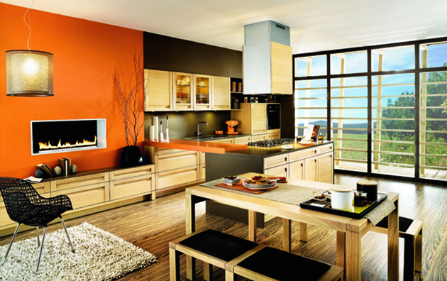 Originálním prvkem této sestavy se stalo prosvětlení skleněné plochy nad linkou z tmavého dřeva. (Alnus)