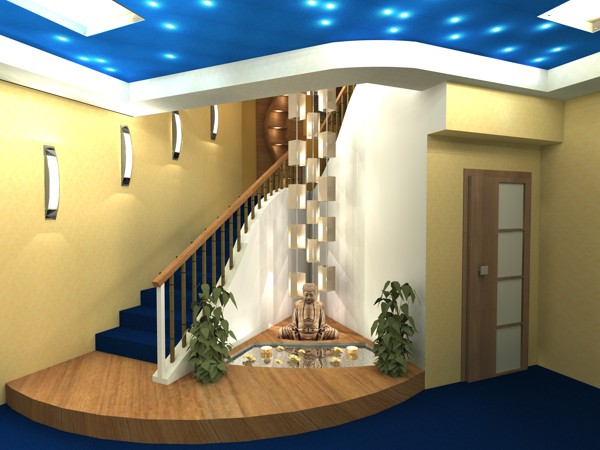 Schodiště v jihozápadním sektoru, který je spojený s energií země, podporuje jej energie ohně. Pro stěny schodiště je použitý kamenný obklad a svítidlo zastupuje energii ohně. Zároveň příjemně vede energii mezi jednotlivými podlažími