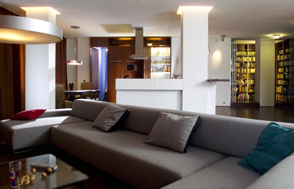 K maskování může posloužit třeba vyvýšený pracovní ostrůvek. Společenská část je tvořena velkým jídelním stolem, který by neměl sloužit jen k nedělnímu obědu. Tento prostor proto vybavíme vším, co by členy rodiny pozvalo ke stolu – příborníkem, vinotékou, dostatečným a variabilním osvětlením, aby na stole bylo možné povečeřet za intimního osvětlení,slepit precizní model Titaniku.