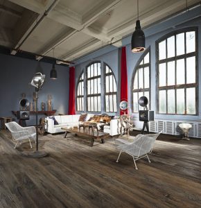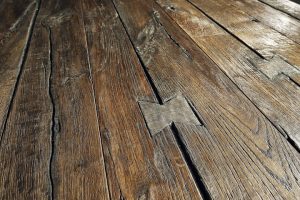 Povrchová úprava, která velmi zdařile napodobuje efekt opotřebovanosti v nejrůznějším stádiu, se nejdříve objevila právě u dřevěných materiálů. Vzhled nových kvalitních podlahovin odpovídajících tomuto typu je vlastně splněným snem pro vyznavače retrostylu, kteří obecně preferují look „dotýkaných věcí“ s historií. Zpočátku šlo o umělé zestařování, díky němuž podlahoviny ve výsledném efektu vypadaly jako kdysi po dlouhodobém pískování a kartáčování, tedy s plasticitou zdůrazňující spárování i přirozené růstové dekory a vady dřeva, velké suky a praskliny. Za posledních pár let se tento trend výrazně prohloubil a zdá se, jakoby designová cena krytiny rostla s mírou „poškození“ jejího povrchu. Jde například o stopy způsobené různými nástroji, třeba hoblíkem nebo katrem, in jsou hluboké praskliny či „vymletiny“ „opravované“ postaru záplatami čtvercových nebo mašličkových tvarů… Působivost těchto podlahovin umocňují také zkosené a sražené podélné hrany jednotlivých dílců. Popsané efekty však samozřejmě nejsou důsledkem dlouhodobého používání a namáhání podlahy, ale vznikly díky novým výrobním technologiím. Netrvalo dlouho, a podobné zestařovací prvky začaly pronikat i do segmentu dýhovaných, laminátových, a dokonce i vinylových materiálů.