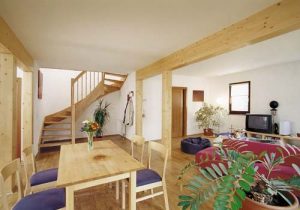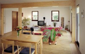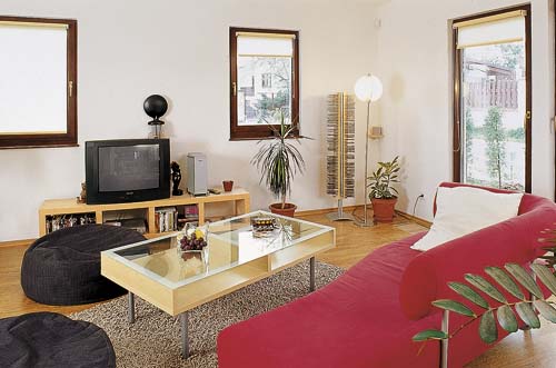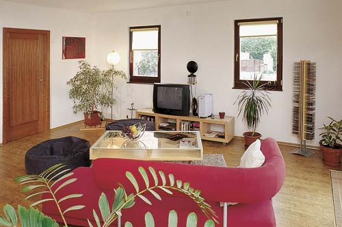 Manželé potřebovali najít dům, který se vejde na úzký pozemek i při splnění minimálních předepsaných odstupů. Z nabízeného sortimentu si vybrali typ, který podmínku splňoval. „Velmi se nám zalíbila velká obytná místnost v přízemí, zahrnující kuchyni, jídelnu a obývací pokoj. Nemám ráda zbytečné dveře, nemám ráda malé uzavřené prostory, naopak otevřený interiér je příjemně vzdušný,“ svěřuje se naše hostitelka. „Když přijde návštěva, mohu něco připravovat v kuchyni a stále se s hosty bavit, nemusím nikam odbíhat, vím, co se tady děje, jsem v kontaktu.“