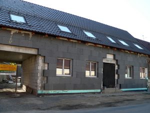 Použití vápenopískových zdicích prvků s úctyhodnými rozměry 498x240x248 mm odpovídá současným trendům ve stavebnictví, kterými je snaha o minimalizování spár. Při zdicích prvcích větších rozměrů se totiž snižuje počet spár, a tím pádem také únik tepla. S ohledem na hmotnost použitých zdicích prvků (16DF-LD 36,5 kg/ks) bylo při zdění využito tzv. minijeřábku, který výrobce, společnost KM Beta, nabízí k zapůjčení. Pomocí těchto břemenových kleští bylo možné tyto větší formáty osazovat přímo z palety ve zdivu. Při každém zdvihu mohou břemenové kleště uchopit až 1 m dlouhou řadu kvádrů a položit je.