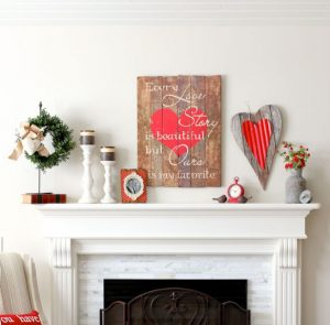 Chcete překvapit svou drahou polovičku? Vyzdobte krásně polici nebo třeba krbovou římsu. Potřebujete k tomu jen kus provázku, na který připevníte papírové kartičky s nápisem a stejně laděné kartony s nápisem, které připevníte ke kancelářské podložce na dokumenty. Místo jedné rostlinky pak můžete naaranžovat třeba krabičku se snubním prstenem. Jistě to vaše milá ocení, pokud máte v plánu ji v tento den požádat o ruku.