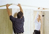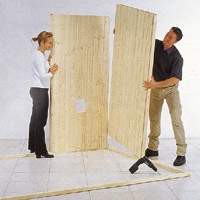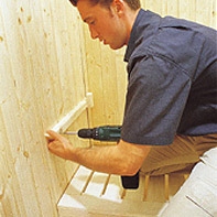 3. Nyní na rohu přišroubujte dvě z bočních stran. Tím je začátek pro finskou potící komoru hotový. Nyní budete potřebovat pomocníka. Umístěte právě smontovanou část na základ. Drážka a pero zapadají do sebe a roh je stabilní.