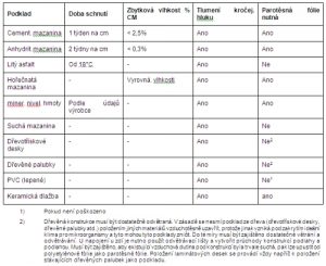 Laminátové podlahy lze pokládat téměř všechny podklady. Vhodné podklady a také podmínky pokládky jsou uvedeny v následujícím přehledu. Protože uvedené doby schnutí závisí na klimatických podmínkách, je nutno je brát pouze jako orientační. Pro jistotu se připočítávají 2 týdny. Jako podklad nejsou vhodné: staré kobercové podlahy, jehlová plsť (nehygienické, částečně příliš měkké, chybějící parotěstnost), xylolitu mazalina (vysoká zbytková vlhkost).